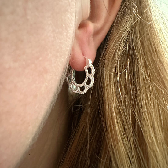 Small but structured, dainty but bold—these best-selling earrings are your go-to when you want something with presence that’s still easy to wear every day. The lace texture is rich and detailed, modeled from hand crocheted lace and cast into solid metal to preserve every stitch.