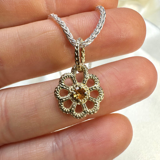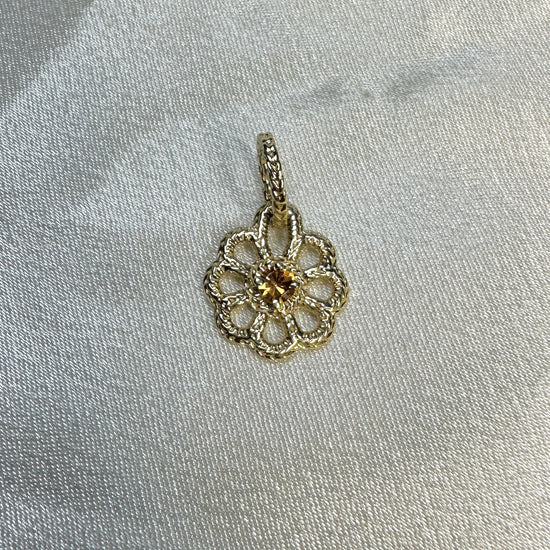 The Fiona Charm is a special piece that I crocheted right after my niece Fiona was born. I knew I wanted something sweet that held a gemstone nestled in the center and this scalloped floral motif felt like the perfect nod to her.
