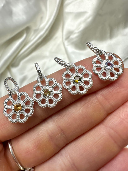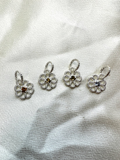 The Fiona Charm is a special piece that I crocheted right after my niece Fiona was born. I knew I wanted something sweet that held a gemstone nestled in the center and this scalloped floral motif felt like the perfect nod to her.