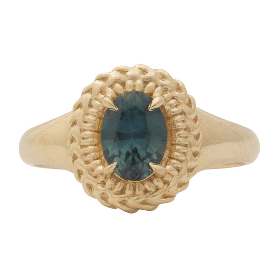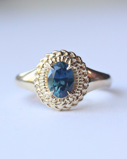 Set in solid 10k gold, the oval sapphire is surrounded by a delicate halo modeled from hand crocheted lace. The shape is soft and balanced, with just the right mix of texture and polish.