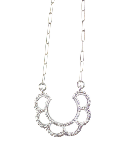 The Mary Necklace features the same romantic scalloped lace texture as the Mary Hoops, this time in a slightly larger pendant that sits just right at your collarbone. Modeled from hand crocheted lace, the texture is rich, detailed, and soft around the edges in that perfect Mary way.