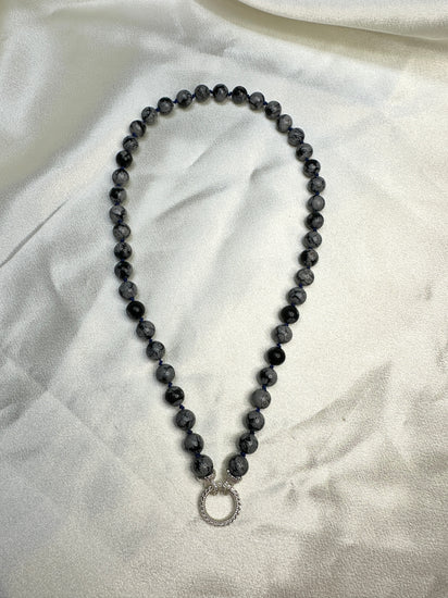 This is a one-of-a-kind Snowflake Obsidian bead strand makes the perfect mostly neutral statement. Each bead is hand knotted on a bright blue silk cord for a pop of color and finished with end caps made from the signature Twyla Dill cast lace. You can choose from a 17.5mm spring ring clasp or the little Nancianna Clasp, depending how you want to wear it.
